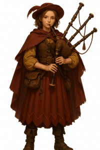 Her bagpipes became her signature—a breath of tempest and yearning that set her apart from the other members of this extraordinary troupe. Her charisma was irresistible: coaxing laughter from the surliest merchant, silencing a tavern fight, or weaving sorrow into song so haunting that listeners found themselves weeping for a loss they couldn’t name. Yet it was her reckless nature—her willingness to leap before looking, to gamble everything for the thrill of the unknown—that drew both admiration and concern from the rest of the troupe.