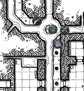 The party continue down the passageway a little further, this time staying closely together in case of any further attacks. They stop when they come across two doors, one to their left and one to their right.