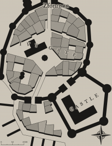 Zfonroon is a small walled town, it has but one entrance to the north and a second from the small harbour to the south. The small town is typical of those to be found in Allonia, it is dark and foreboding, not somewhere anyone would willing come to without good reason. There are only three classes of peoples in Zfonroon, the elite who live in the citadel, the trusted slaves who make up the slave masters and guards and at the bottom the slaves themselves.